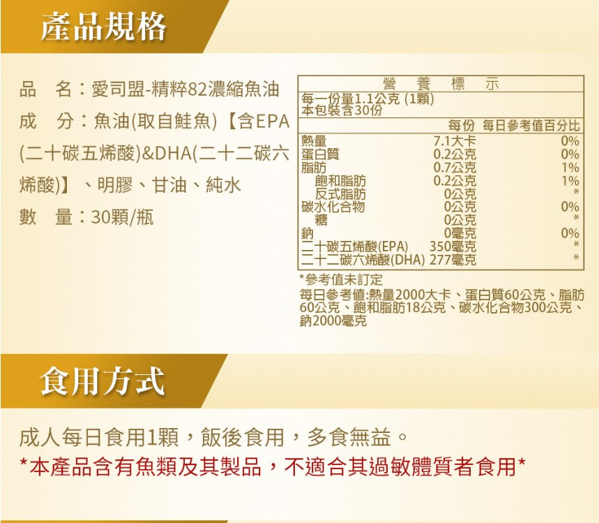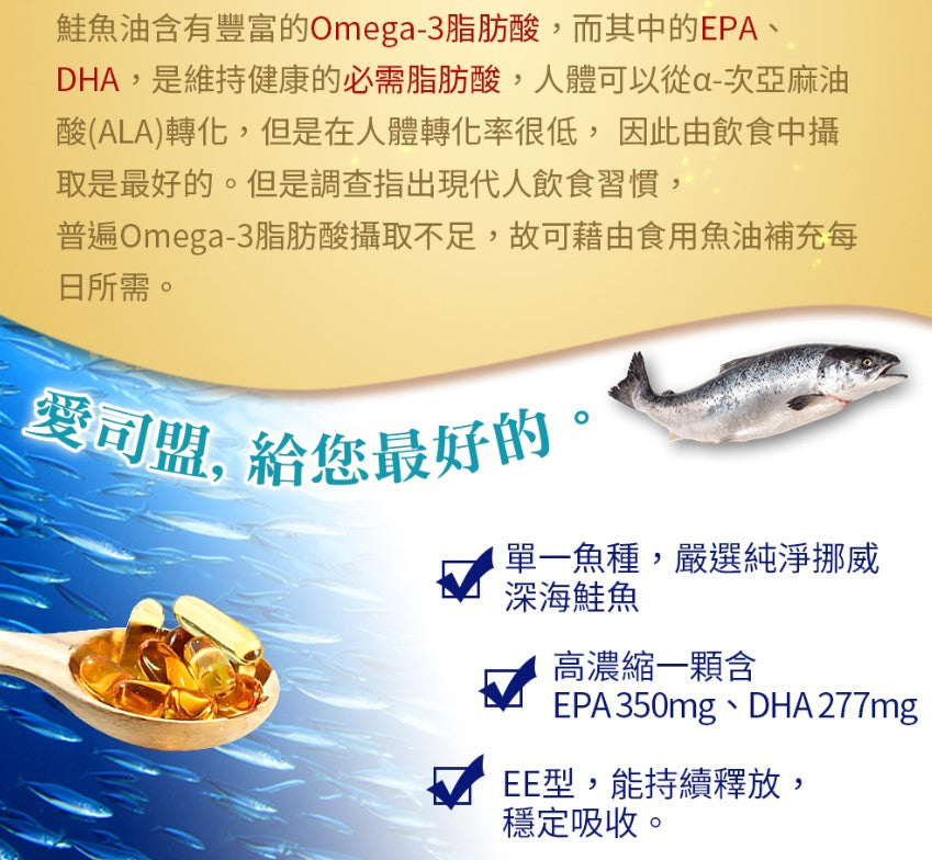 並非所有魚油都能稱為「精粹」。愛司盟精粹82濃縮魚油 嚴選挪威深海純淨鮭魚,透過高科技分子蒸餾技術,將 Omega-3 濃度提升至極致。專為高壓工作、頻繁外食及運動愛好者設計,每日只需一顆,即可補足身體無法自行合成的必需脂肪酸。
